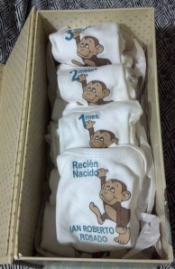 This was my baby shower gift, 13 Onesies! I designed it on “My Digital Studio” and printed them on iron-on transfer paper. The first one says Just Born in Spanish “Recien Nacido” and the baby’s name. The next 12 have months 1 – 12 on them. An easy way to document each month with a picture!