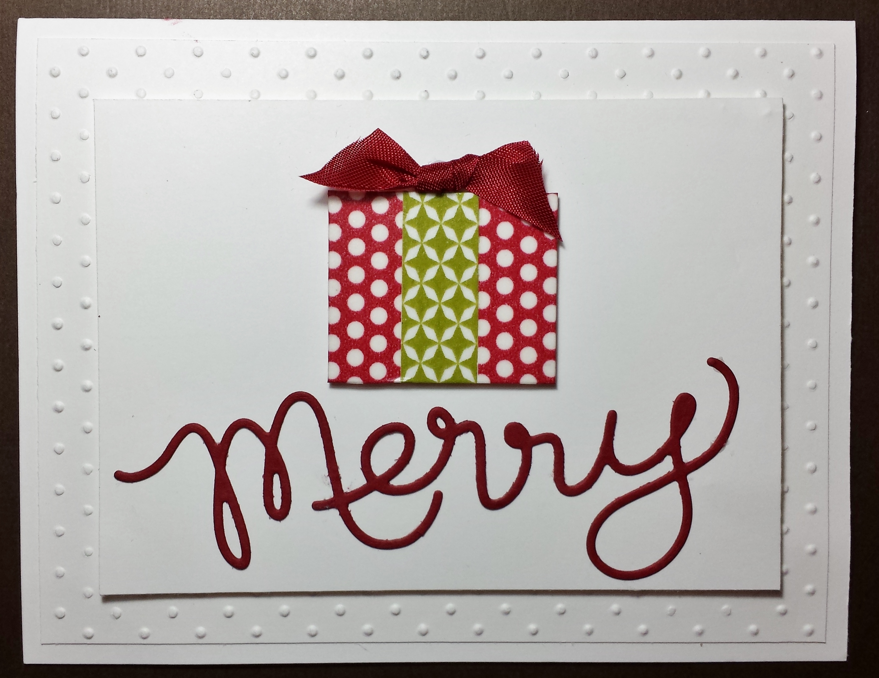 There’s something to say about monochromatic or semi-monochromatic cards, they are simple and yet artful. By using embossing folders you can give the card dimension. To break up the monochromatic style I used the Season of Style Designer Washi Tape (132155) from the Holiday catalog to wrap a 1-1/2 x 1-1/4 piece of card stock into a present and topped it off with Cherry Cobbler seam binding ribbon. Now for the icing on the cake or the word on the card… I used one of my new favorite products, “Merry” from the Expressions Thinlits Dies (132171) also in the Holiday catalog.