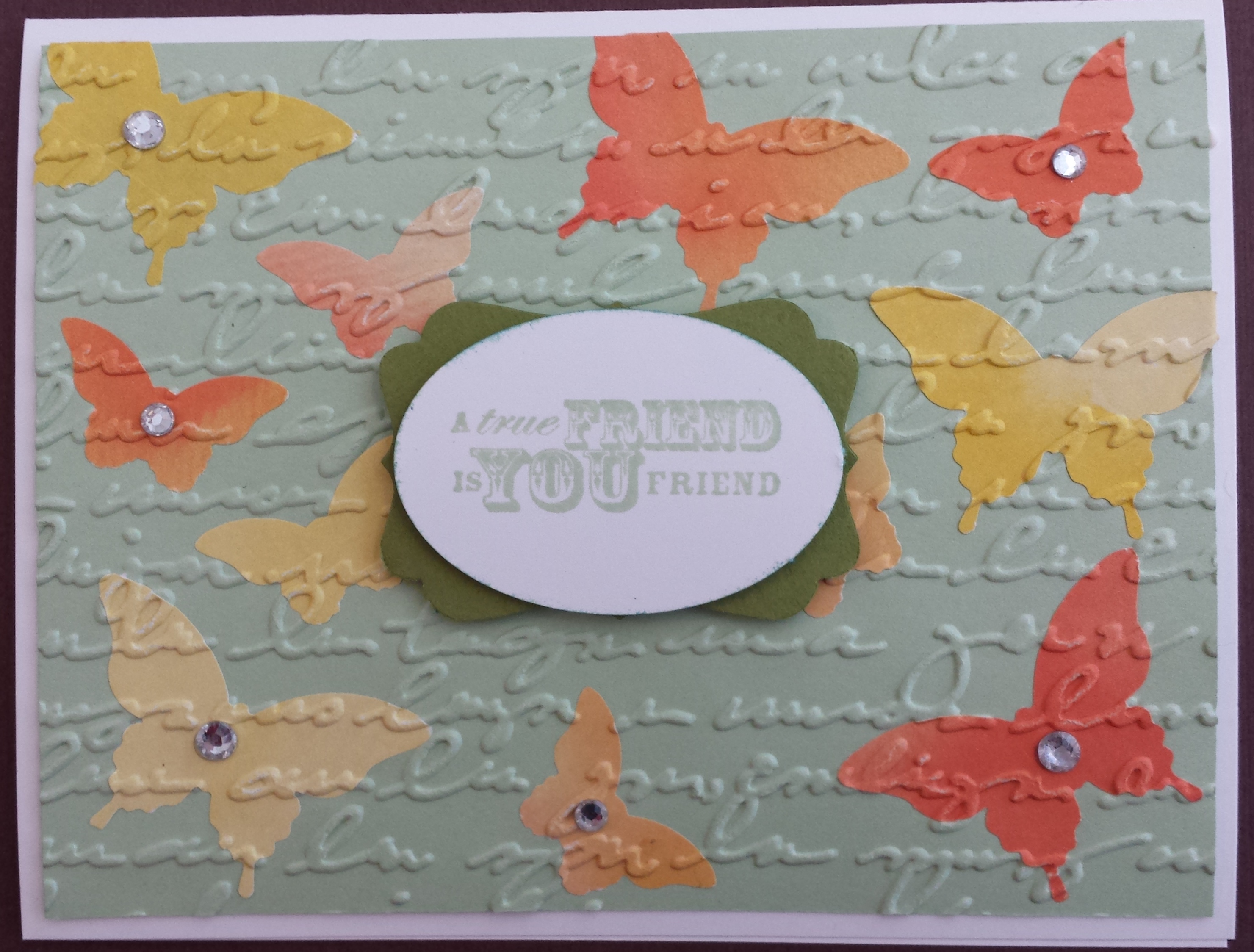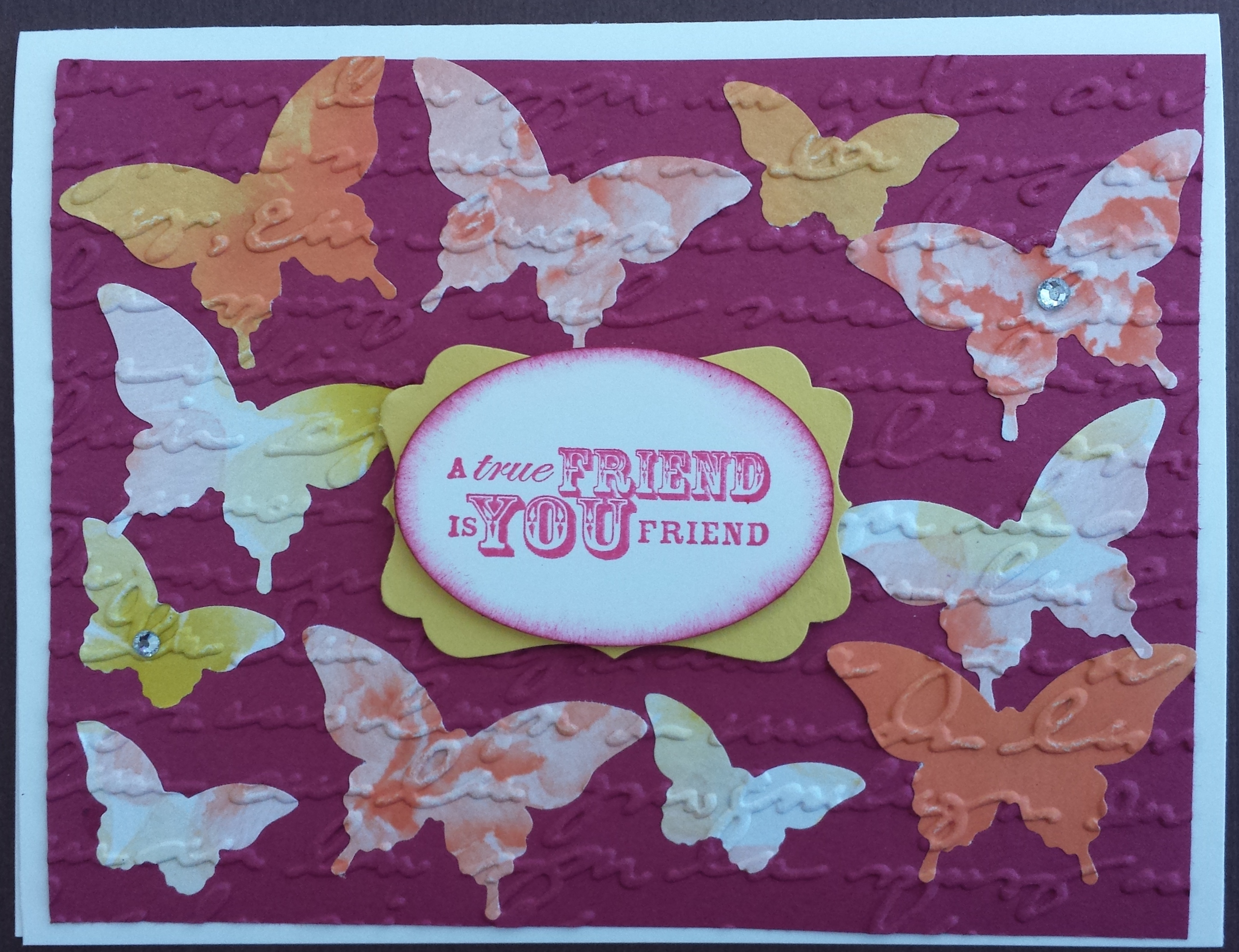 One of the cards we made at my recent Technique Card class was a Butterfly card using an embossing technique. For this technique you take random pieces of punched Designer Series Paper (DSP) with a small amount of adhesive and place them on a piece of cardstock. Then using the Pretty Print Textured Impressions Embossing Folder featured in our latest Holiday Mini you run it through the big shot and the become fused.