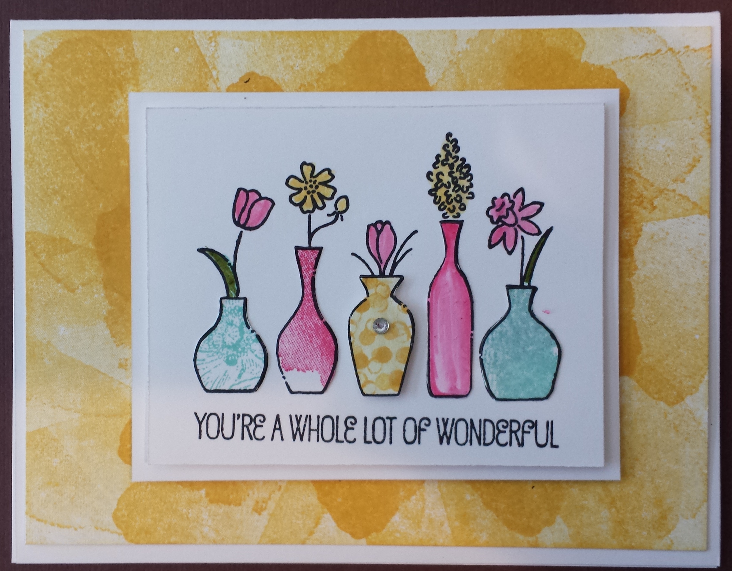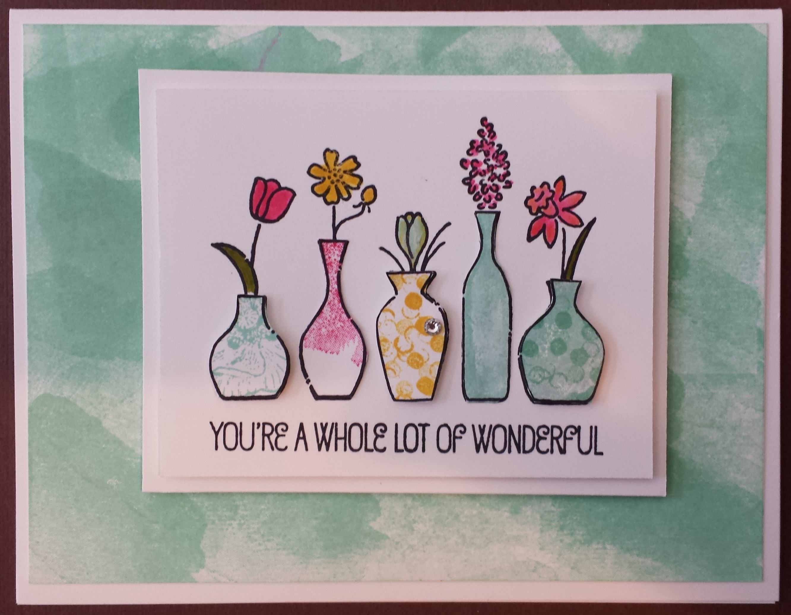 This is what I call a Faux Watercoloring, it looks like watercolor but it’s actually our Happy Watercolor stamp set which has the textured watercolor look. In addition to the Happy Watercolor stamp set we used the Vivid Vase stamp set. Both of these are in our current Celebrate the Everyday mini catalog available until June 1.