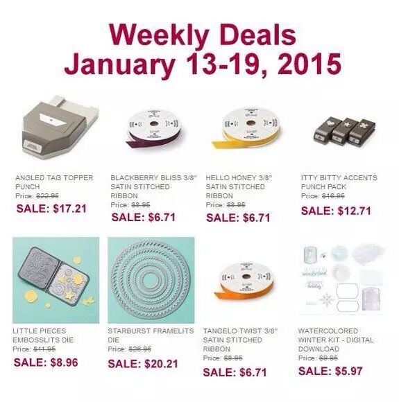 January 13, 2015 Uncategorized Weekly Deals Posted by Wanda Smith, Independent Stampin'Up Demonstrator Still having laptop problems and haven’t been able to load all the videos I’ve promised, hopefully soon. Meanwhile enjoy Stampin’Up weekly deals. Rate this:Share this: Click to share on Facebook (Opens in new window) Facebook Click to share on Pinterest (Opens in new window) Pinterest Click to email a link to a friend (Opens in new window) Email Click to print (Opens in new window) Print Like Loading...