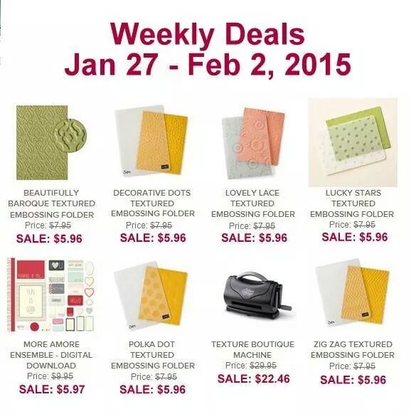 January 27, 2015 Uncategorized Weekly Deals – February 2nd Posted by Wanda Smith, Independent Stampin'Up Demonstrator Here are the latest weekly deals, lots of Impressions Embossing Folders! Rate this:Share this: Click to share on Facebook (Opens in new window) Facebook Click to share on Pinterest (Opens in new window) Pinterest Click to email a link to a friend (Opens in new window) Email Click to print (Opens in new window) Print Like Loading...