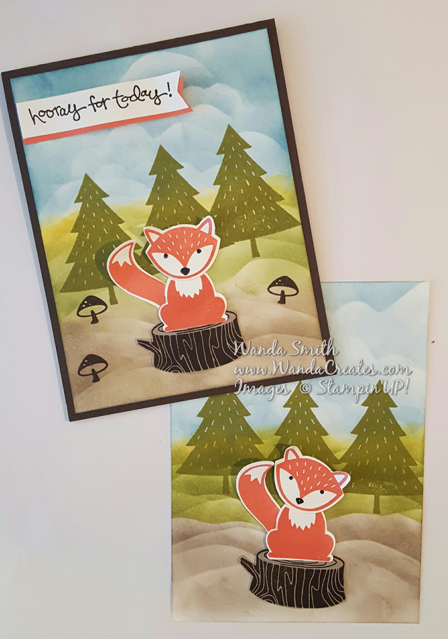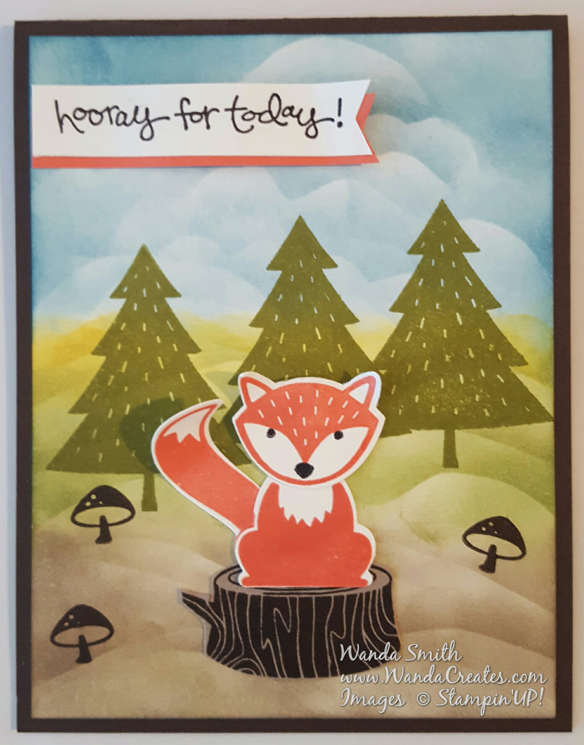 I held my monthly Technique Class this past Saturday and I taught my stampers how to use templates for sponging clouds, hills and mounds. We used the Foxy Friends stamp set and here is the finished card.