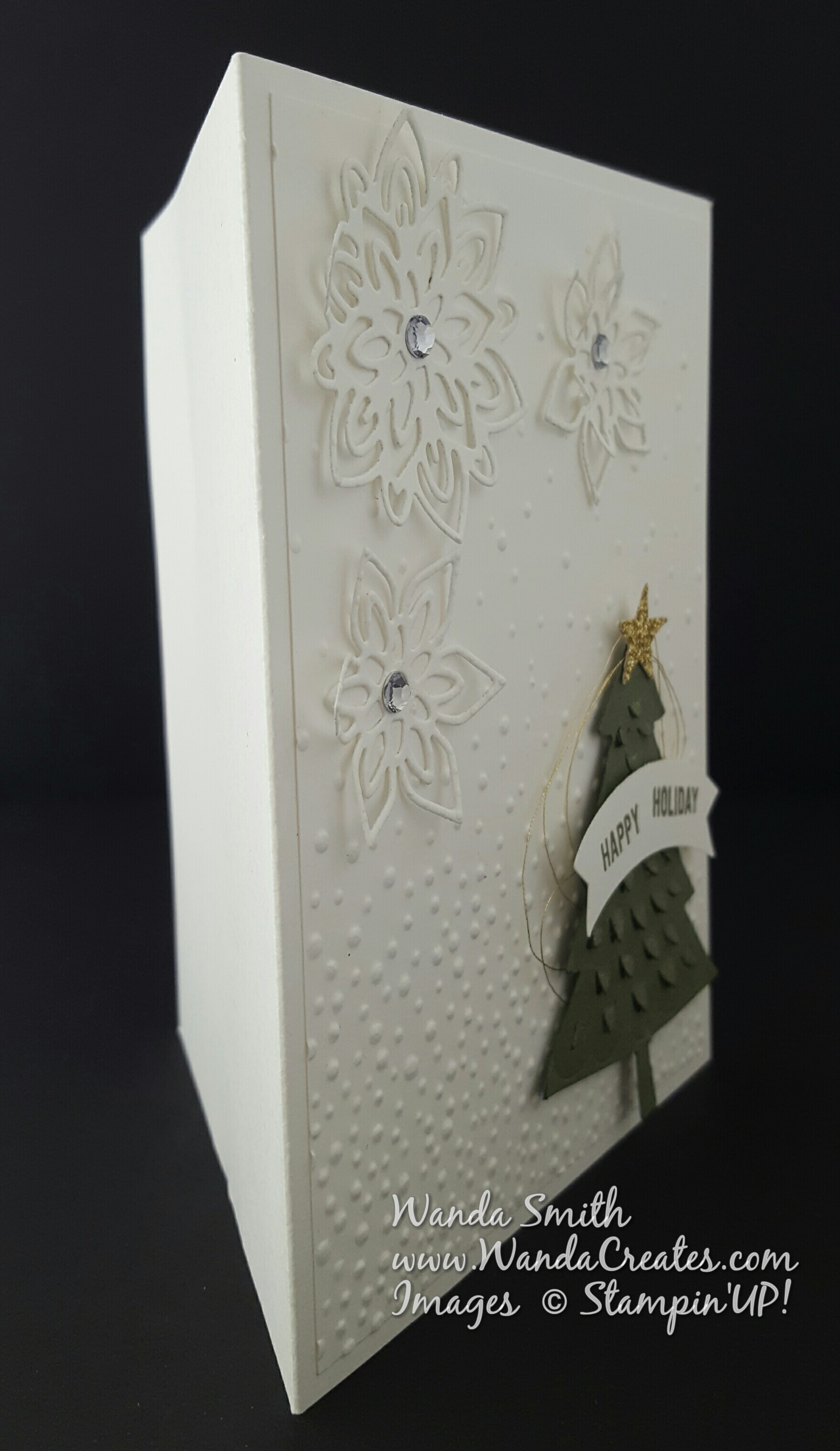 Using the flowers from the Flourish Thinlits was a great idea. I decided to change the tree from the Peaceful Pines Stamp Set to just cutting out a tree from the coordinating Perfect Pines Framelits and then cutting/embossing it with the same framelit set for this look.