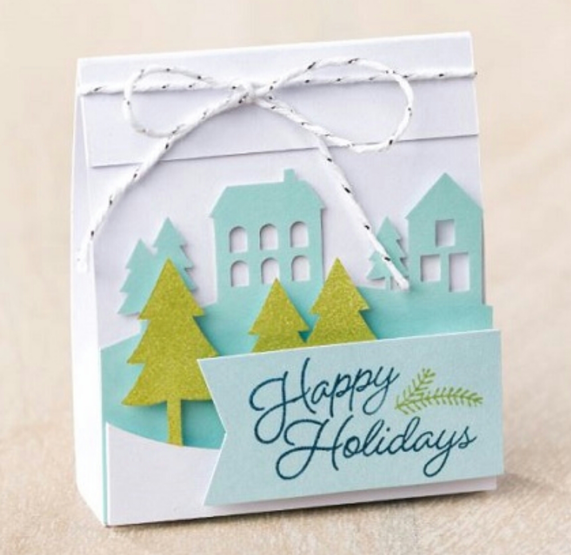 Stampin ‘Up! changed the box to match the kit, it’s holiday cards, includes two Classic Stampin’ Spots, and it’s unlike anything they’ve done before in Paper Pumpkin. The laser cut pieces are similar to Edgelits and give the cards wonderful depth and character. As you layer the houses and trees with dimensionals, a lovely little landscape takes shape and helps you feel right at home for the holidays.