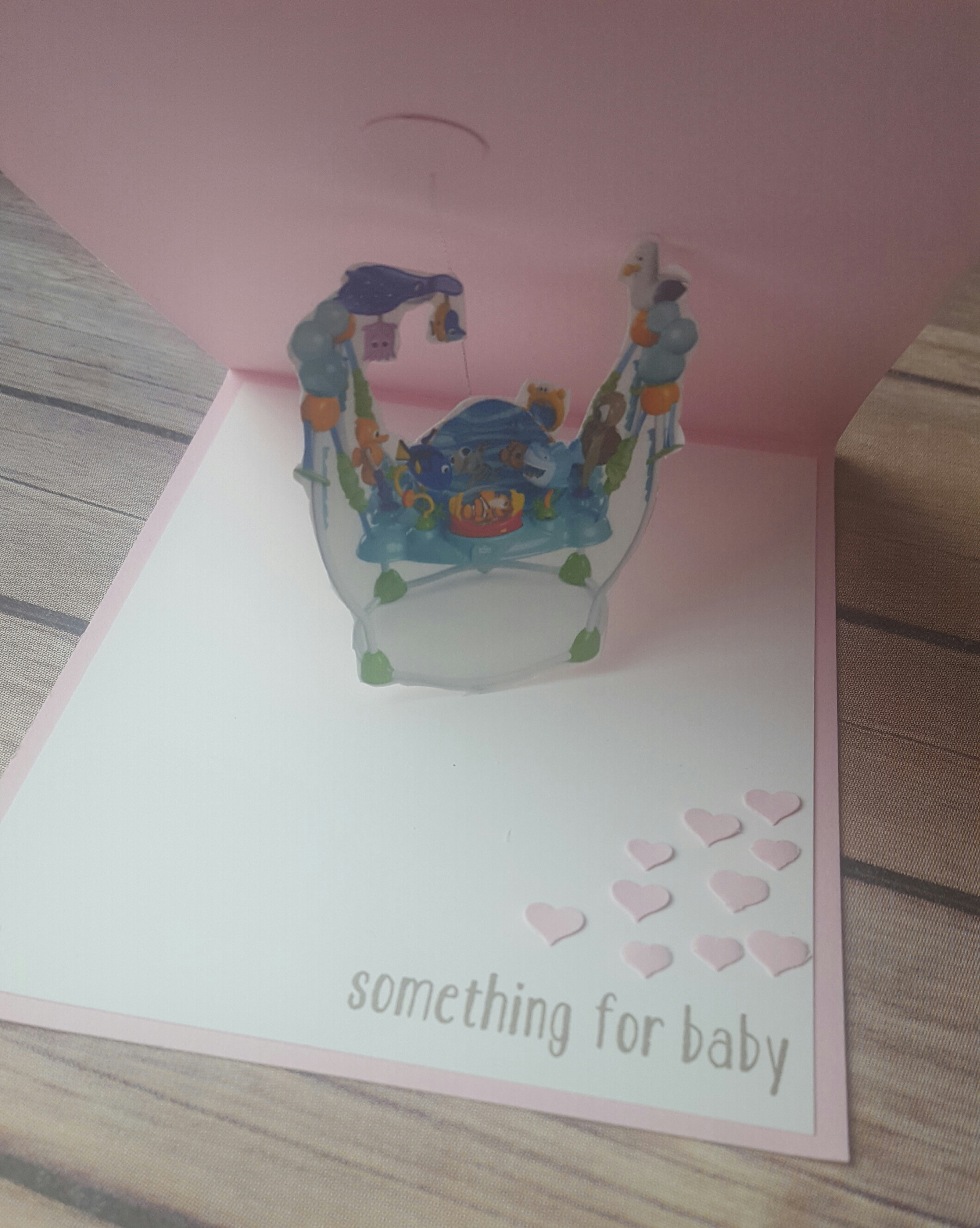 My gift was a bouncy spinner baby thingy and I had it shipped to her house. I wanted her to see what I got her so printed a copy of it and had it dangle from the top of the inside.