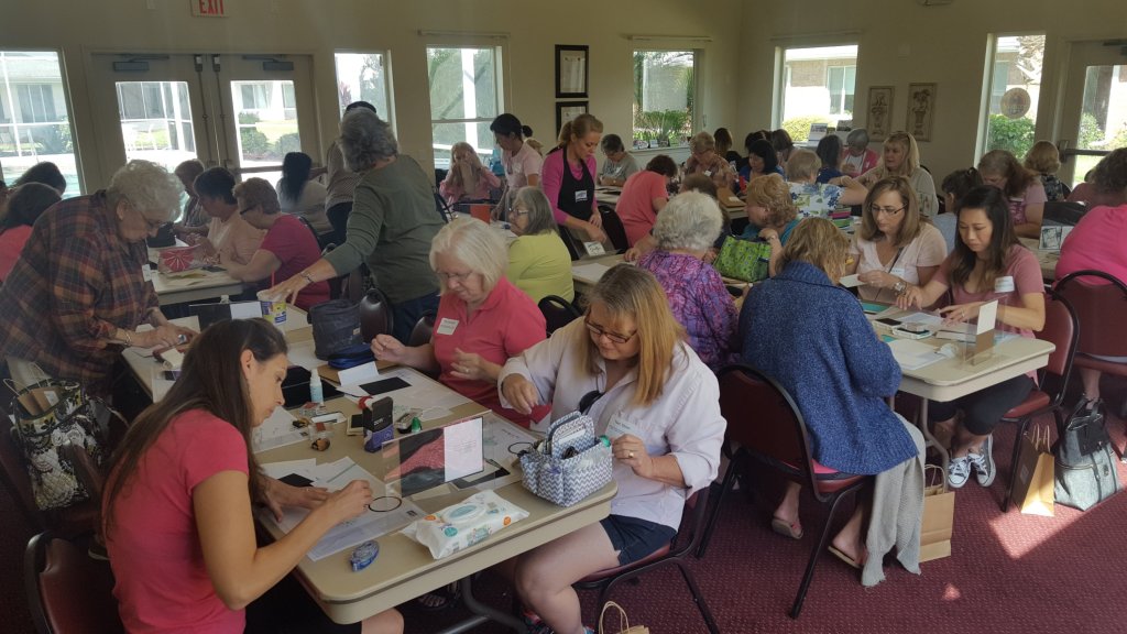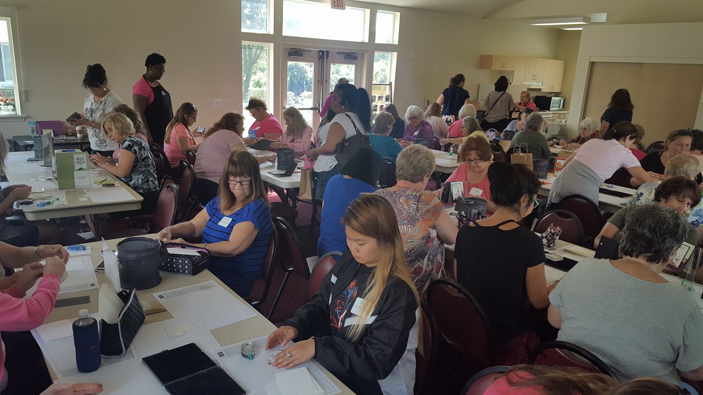 For the past 3 years my friends and I (Stampin’ Amigas) have been hosting a World Card Making Day event in Oviedo, FL. We had 50 stampers stamping away making their greeting cards and having loads of fun! Each stamper made 8 cards (see below) and we gave away over 20 door prizes. We also raffled off all the products on a page of the Annual Stampin’ Up catalog.
