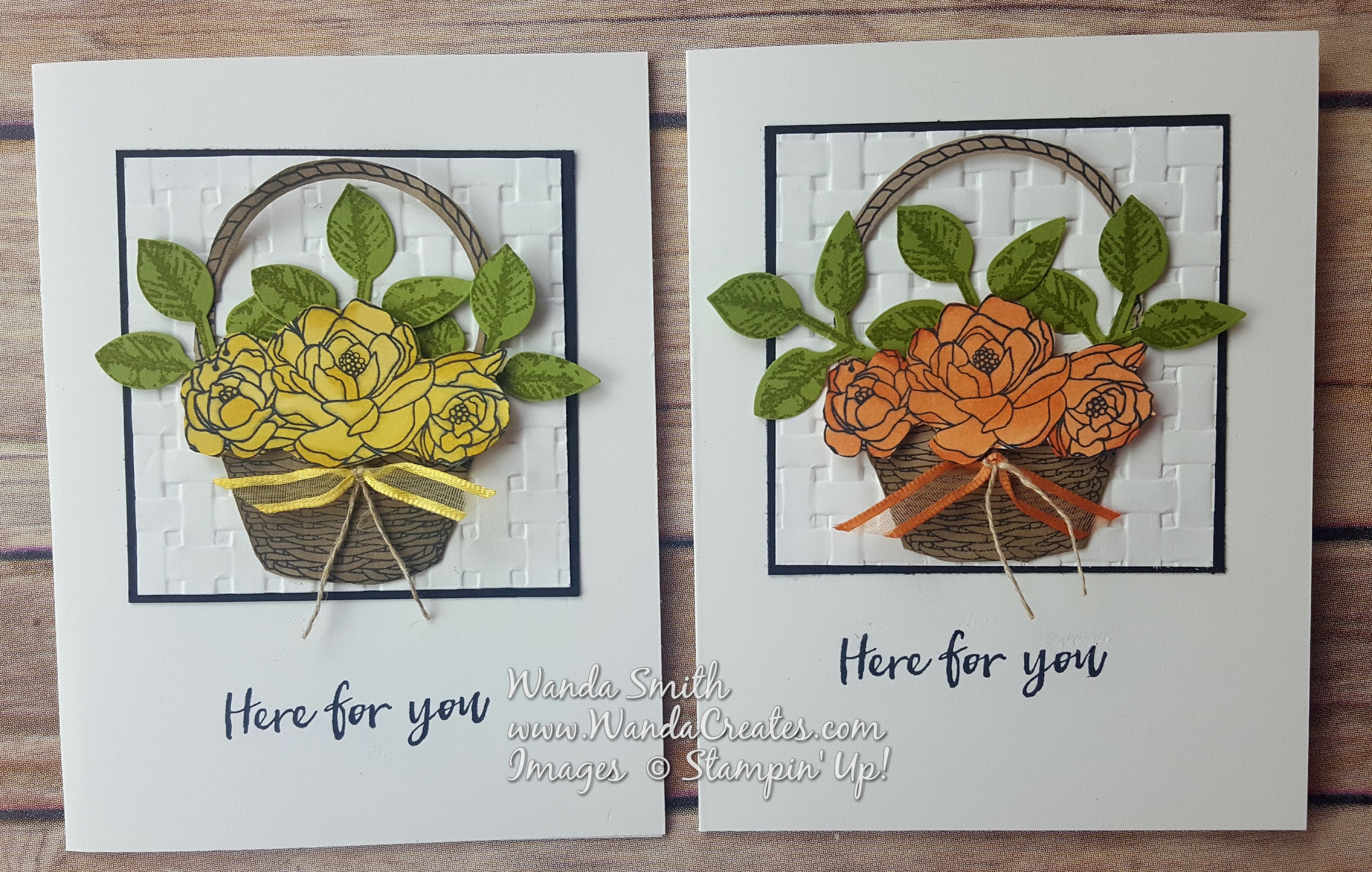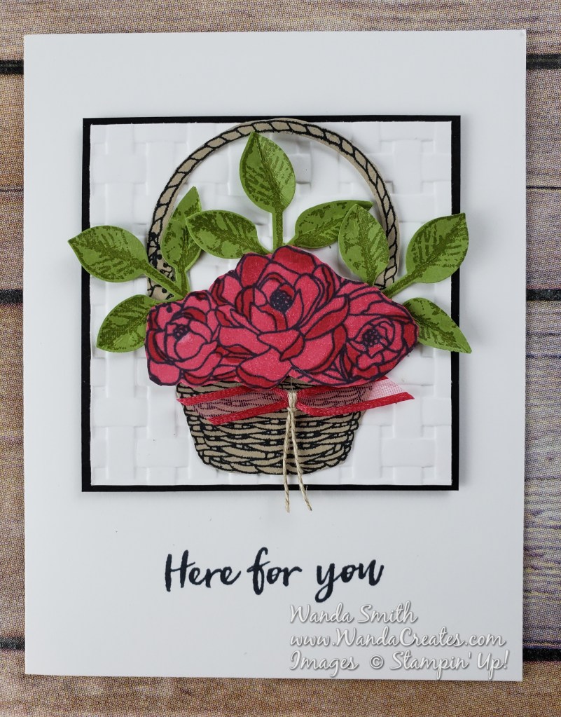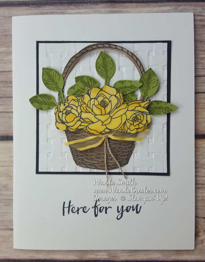 Every time I saw a card made with the Blossoming Basket Bundle I cringed at the fussy cutting needed if you wanted the basket and flowers to pop. Then I figured out that if you use the 1-3/4″ Circle Punch you can almost get a perfect cut of the inside part of the handle. Then there was the coloring of the flowers…not so hard with my messy blending technique.