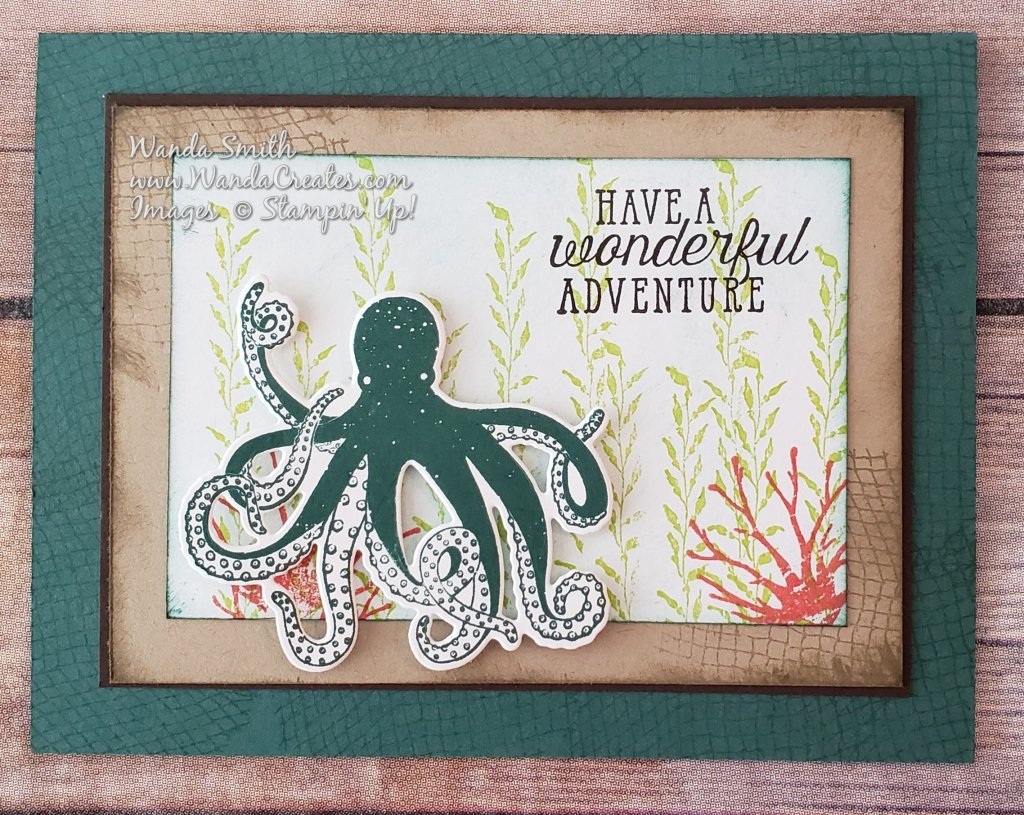- Stamp the Octopus on Whisper White cardstock (3″ x 2-1/2″) with Tranquil Tide ink and cut out with the matching die. then mount Octopus with Stampin’ Dimensionals onto the stamped Whisper White cardstock layer