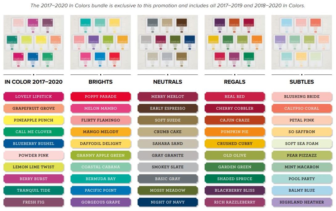 • The 2017–2020 In Color Classic Stampin’ Pads bundle (item 150289) is exclusive to this promotion and includes all colours in both the 2017–2019 In Colors as well as those as the 2018–2020 In Colors.