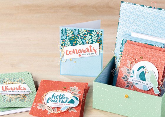 It’s easy to create a stack of all-occasion cards with the all-inclusive Soft Sayings Card Kit. Stampin’ Up! trainer, Holly,